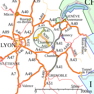 - the A41 South: 41 km long; mainly 2x2 lanes, 2x3 lanes near Grenoble;