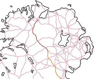 ![]() The route of the A5 in red linking Derry city and Aughnacloy, County Tyrone). The continuation of this route in the Republic of Ireland, the N2, is shown in orange. | |