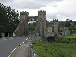 The mock medieval towers were built in 1829 when crossing the bridge required paying a toll. The bridge itself lies on the position of a ferry crossing.[16]
