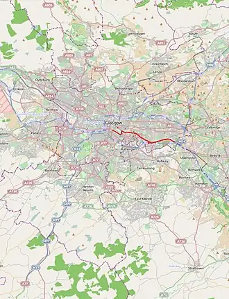 Beyond Hamilton, it followed the Glasgow Road north-west, crossing the Clyde at the Dalmarnock Bridge. It ended at the junction of Trongate and Gallowgate in the east end of Glasgow city centre.[3] According to a summary in a report by the Institution of Civil Engineers, the length was 150 kilometres (93 miles).[4]