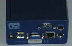 The A9home was smaller than the Mac Mini and housed in cobalt-blue aluminium casing, measuring 168 mm × 103 mm × 53 mm in size.[7] The machine runs on a 400 MHz Samsung ARM9 processor, has 128 MB SDRAM of main memory and 8 MB VRAM and houses an internal hard disk of 40 GB. On the front, it features two USB 1.1 ports, a microphone and a headphones socket. On the rear, it has two USB 1.1 ports, two PS/2 ports, 10/100 BaseT network port, a RS-232 serial port and a power connection socket. Like the Mac Mini of 2009 and earlier, it is powered by an external PSU (5 V, 20 W). Furthermore, it has a power/reset switch, a status/health indicator and a drive activity indicator LED. The A9home is not designed to be internally expanded.