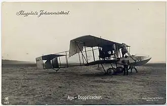 In 1912, a separate division was set up in Johannisthal under the name Ago Flugzeugwerke, with Elisabeth Woerner and Hermann Fremery as directors. After the outbreak of World War I, AGO built a series of military reconnaissance aircraft, beginning with the AGO C.I – a pusher-powered biplane designed by August Haefeli. The most successful of AGO's wartime aircraft was the C.IV of 1916, of which 70 examples were built.