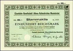 In 1879, HK Notnagel & Co. of Altona, a lessee of Himmelmoor, located in Quickborn, where peat was mined for heating, called for the construction of a railway for the transport of peat. The municipalities of Quickborn and Kaltenkirchen and the then independent town of Altona supported this project. After the founding of the Altona-Kaltenkirchner Eisenbahn-Gesellschaft (Altona-Kaltenkirchen Railway Company, AKE) in 1883 and an expression of support from the Emperor on 27 April 1883, the construction of the new railway had already started in the autumn of 1883. On 8 September 1884, passenger traffic commenced on the line from Gählerplatz in Altona to Kaltenkirchen and on 24 November of the same year the carriage of freight traffic commenced.[1] The shares were subscribed by the town of Altona, the communities of Quickborn, Ulzburg and Kaltenkirchen and the construction company Kintzel & Lauser. On May 21, 1913, the company as remained Eisenbahn-Gesellschaft Altona-Kaltenkirchen-Neumünster.