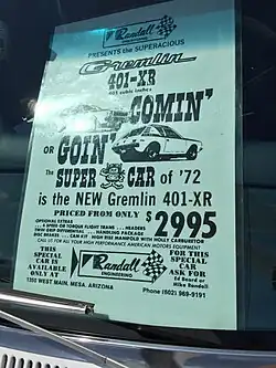 Randall AMC dealership in Mesa, Arizona, received AMC's endorsement to build 401 cu in (6.6 L) V8 powered Gremlins. The cars started out as 304 cu in (5.0 L) models from the factory and after Randall's modifications would turn in 13.90 second passes at 103–106 mph (166–171 km/h) in the quarter mile, for $2,995. Known as the Randall 401-XR (X for Gremlin X, R for Randall), a total of twenty cars were built for the street and one for the strip during 1972, 1973, and 1974. In 2012, the Randalls built a 22nd Continuation Plum 1974 Gremlin 401XR, originally intending to build a few, but completed only one.[58] Car Craft magazine tested one with some modifications and achieved 115.07 mph (185.19 km/h) in 12.22 seconds in the quarter while still remaining a "totally streetable, daily-driver".[59] In 1972, Super Stock and Drag Illustrated magazine had a "Special Gremlin" issue. One of the many venues where Randall's 1972 Gremlin 401XR Super Stock car at the 1972 Winternationals.