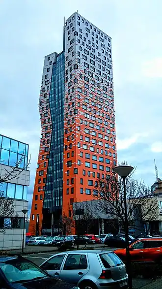 The AZ Tower is a skyscraper in the city of Brno, Czech Republic. The tower is 111 m (364 ft) tall, and it has 30 floors.[1] It is currently the tallest building in the Czech Republic.[2] Construction of the building commenced in 2011 and completed in April 2013. The building has a floor area of over 17,000 m2 (180,000 sq ft). It is utilized for office, retail and residential purposes.