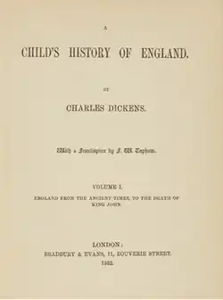 A Child's History of England is a book by English author Charles Dickens. It first appeared in serial form in Household Words, running from 25 January 1851 to 10 December 1853. Dickens also published the work in book form in three volumes: the first volume on 20 December 1851, the second on 25 December 1852 and the third on 24 December 1853.[1] Although the volumes were published in December, each was postdated the following year. They bore the titles: