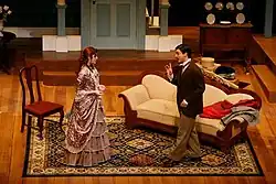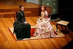 In August 2013, Young Vic[35] produced a new adaptation[36] of A Doll's House directed by Carrie Cracknell[37] based on the English language version by Simon Stephens. In September 2014, in partnership with Brisbane Festival, La Boite Theatre Company located in Brisbane, Australia, hosted an adaptation of A Doll's House written by Lally Katz and directed by Stephen Mitchell Wright.[38] In June 2015, Space Arts Centre in London staged an adaptation of A Doll's House featuring the discarded alternate ending.[39] 'Manaveli' Toronto staged a Tamil version of A Doll's House (ஒரு பொம்மையின் வீடு) on 30 June 2018, translated and directed by Mr P Vikneswaran. The drama was very well received by the Tamil community in Toronto and was staged again a few months later. The same stage play was filmed at the beginning of 2019 and screened in Toronto on 4 May 2019. The film was received with very good reviews, and the artists were hailed for their performance. Arrangements were made to screen the film in London, at Safari Cinema Harrow, on 7 July 2019.[39] From September 2019 to October 2019, the Lyric Hammersmith in London hosted a new adaptation of the play by Tanika Gupta who moved the setting of the play to colonial India.[40] Though the plot largely remained unchanged, the protagonists were renamed Tom and Niru Helmer and a conversation was added regarding the British oppression of the Indian public. One significant shift was the lack of a slamming door at the end of the play. They also published a pack of teaching materials which includes extracts from the adapted play script.[41]