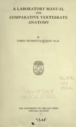 A Laboratory Manual for Comparative Vertebrate Anatomy is a textbook written by Libbie Hyman in 1922 and released as the first edition from the University of Chicago Press. It is also called and published simply as Comparative Vertebrate Anatomy. In 1942 Hyman released the second edition as a textbook, as well as a laboratory manual. It was referred to as her 'bread and butter', as she relied on its royalties for income. The Laboratory Manual for Comparative Vertebrate Anatomy still remains the same without revisions, and is used by universities around the world. In the book, she uses Balanoglossus, Amphioxus, sea squirt, lamprey, skate, shark, turtle, alligator, chicken, and cat as specimens.