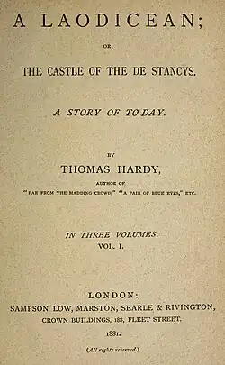 A Laodicean; or, The Castle of the De Stancys. A Story of To-Day is the eighth published novel by English author Thomas Hardy, first published in 1880–81 in Harper's New Monthly Magazine. The plot exhibits devices uncommon in Hardy's other fiction, such as falsified telegrams and faked photographs.