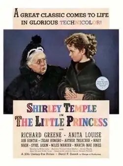 The Little Princess is a 1939 American drama film directed by Walter Lang. The screenplay by Ethel Hill and Walter Ferris is loosely based on the 1905 novel A Little Princess by Frances Hodgson Burnett. It was the first Shirley Temple movie to be filmed completely in Technicolor.[3] It was also her last major success as a child star.[4] This film was the third of three in which Shirley Temple and Cesar Romero appeared together, following Wee Willie Winkie (1937) and Ali Baba Goes to Town (1937).[5]