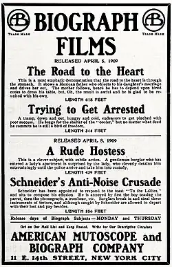 - ^ Advertisement for the two 1909 Biograph split-reel releases A Rude Hostess and Schneider's Anti-Noise Crusade; published in the trade journal The Moving Picture World, 3 April 1909, p. 393. Internet Archive (hereinafter cited "I.A."), San Francisco, California. Retrieved 9 May 2021.