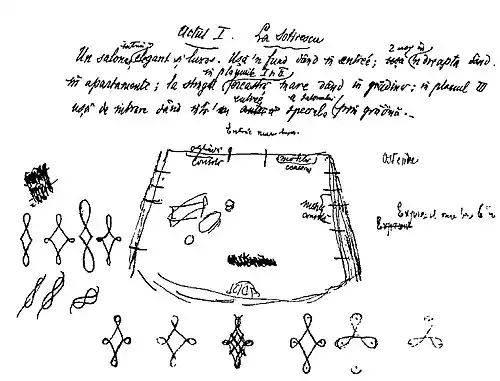 The language matter is also explored in the character's own name—since, as argued by sociolinguist Constantin-Ioan Mladin, Caragiale's in-play anthroponymy is designed to provide instant clues as to one's class origins and intellectual level: "Caragiale's demonstrates outstanding skill in characterizing people by their surnames, by their given names, and especially by a juxtaposition of both."[29] "Rică" is a diminutive form accepted by several Romanian names, most commonly associated with "Aurel";[30] Caragiale's papers clarify that it stood for "Andrei" (Andrew), something which is also supported by a portion of the play—in which the panicking young man calls on his patron saint, Andrew the Apostle.[31] The sketched-out sequel Titircă, Sotirescu & C-ie includes the complete and updated form of his name, as "Andrei Venturianu".[32] In composing both names, especially in the earlier format, he strives for the inherently funny, with a humorous musical contrast. In addition to resembling the onomatopoeia of rooster crows, and as such introducing hints of machismo,[30] "Rică" suggests "familiarity and cheerfulness" and the mahala atmosphere, while "Venturiano" is pronounced with a voiced nasal and then a rising tone, giving it unexpected gravitas.[33]