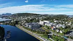 In Norwegian, Ålesund is considered to be a by which can be translated as a town or a city.[1] Ålesund is the ninth largest town/city in Norway.[5] The town has become more of an urban agglomeration during the late part of the 20th century and the urban area has spread out and into the neighboring Sula Municipality. The 28.93-square-kilometre (7,150-acre) town has a population (2024) of 55,684 and a population density of 1,925 inhabitants per square kilometre (4,990/sq mi). About 21.75 square kilometres (8.40 sq mi) of the town with a population of 46,554 lies in Ålesund Municipality and the remaining 7.19 square kilometres (2.78 sq mi) of the town with a population of 9,130 lies in Sula Municipality.[2]