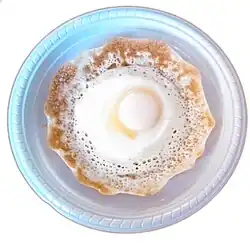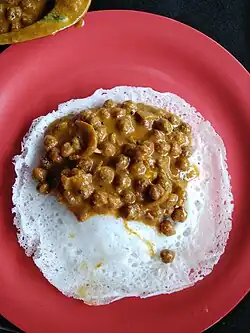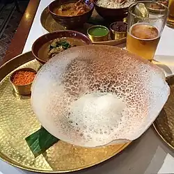 An appam or vellayappam is a type of thin pancake originating from South India.[1] It is made with fermented rice batter and coconut milk, traditionally cooked in an appachatti, a deep pan similar in shape to a wok. It is a popular dish in the Indian states of Kerala and Tamil Nadu and in Sri Lanka.[2] In Sri Lanka, it is popularly known as hoppers. Appams are most frequently served for breakfast or dinner, often with a side dish such as a vegetable or egg curry.
