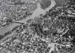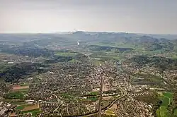 The old city of Aarau is situated on a rocky outcrop at a narrowing of the Aare river valley, at the southern foot of the Jura mountains.[7] Newer districts of the city lie to the south and east of the outcrop, as well as higher up the mountain, and in the valley on both sides of the Aare. The neighboring municipalities are Küttigen to the north and Buchs to the east, Suhr to the south-east, Unterentfelden to the south, and Eppenberg-Wöschnau and Erlinsbach to the west. Aarau and the nearby neighboring municipalities have grown together and now form an interconnected agglomeration. The only exception is Unterentfelden whose settlements are divided from Aarau by the extensive forests of Gönhard and Zelgli. Approximately nine-tenths of the city is south of the Aare, and one tenth is to the north. It has an area, as of 2006, of 8.9 km2 (3.4 sq mi). Of this area, 6.3% is used for agricultural purposes, while 34% is forested. Of the rest of the land, 55.2% is settled (buildings or roads) and the remainder (4.5%) is non-productive (rivers or lakes).[8] The lowest elevation, 365 meters (1,198 ft), is found at the banks of the Aar, and the highest elevation, at 471 meters (1,545 ft), is the Hungerberg on the border with Küttigen.