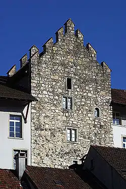 Aarau (Swiss Standard German: [ˈaːraʊ], Alemannic German pronunciation: [ˈɑːræu̯]) is a town, a municipality, and the capital of the northern Swiss canton of Aargau. The town is also the capital of the district of Aarau. It is German-speaking and predominantly Protestant. Aarau is situated on the Swiss plateau, in the valley of the Aare, on the river's right bank, and at the southern foot of the Jura Mountains,[3] and is west of Zurich,[4] 58 kilometres (36 miles) south of Basel and 65 kilometres (40 miles) northeast of Bern.[5] The municipality borders directly on the canton of Solothurn to the west. It is the largest town in Aargau. At the beginning of 2010 Rohr became a district of Aarau.[6]