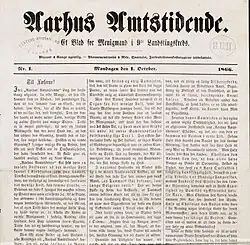 The first issue of Aarhus Amtstidende was published on 1 October 1866.[1][2] Its founders were Lars Bjørnbak, a leftist figure, and JCN Wistoft, a merchant.[3][4] The reason for the establishment of the paper was Lars Bjørnbak's opposition to the constitutional revision carried out in the same year.[4] Bertel Jensen was the editor of the paper.[4] During its early years the paper was a leftist and polemical publication and defended the interests of the masses.[3][4] Therefore, it gained popularity among rural people.[4] Its rival was the conservative newspaper Århus Stiftstidende.[4] In the 1890s, Aarhus Amtstidende became more versatile, but it again adopted its polemical style in the 1920s.[3] This polemical stance led to a decrease in its circulation.[3]