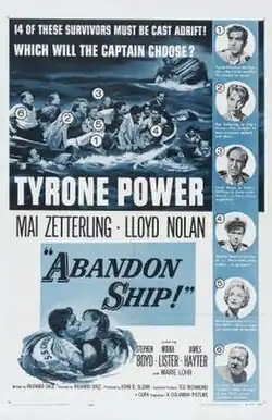 Seven Waves Away (alternate U.S. titles: Abandon Ship! and Seven Days From Now) is a 1957 British adventure film directed by Richard Sale and starring Tyrone Power, Mai Zetterling, Lloyd Nolan, and Stephen Boyd. After his cruise ship hits a mine and with the captain dead, an officer has to make an agonizing decision on an overcrowded lifeboat.