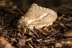Abantiades latipennis, known as the Pindi moth, is a species of moth in the family Hepialidae. It may also be referred to as a swift moth or a ghost moth, as this is a common name associated with Hepialidae.[1] Endemic to Australia and identified in 1932, it is most populous in temperate rainforest where eucalypti are prevalent, as the larvae feed primarily on the roots of these trees. Females lay eggs during flight in a scattering fashion. The larvae live for over eighteen months underground, while adult moths survive for approximately one week, as they have no mouthparts with which to feed. The moths are preyed upon by a number of predators, including bats and owls. Brown in colour overall, males are paler and the identifying silver bars of the male's wings are more prominent than those of the female's, with dark margins. Male adults are generally smaller.