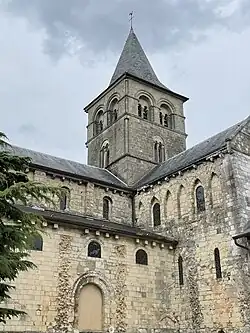 The capitals of the church also differ on the southern and northern parts of the building. On the former, they are figuratively decorated, while on the latter, they were completed in a Carolingian style[7] with simple buds. The two-story crossing tower (now the belfry) rests on a square and is decorated with domed windows, zigzag patterns, and recessed stars. According to the model of Normandy churches, the church of the Abbey was supposed to have two towers; however, one of them was demolished to prevent it from being used as an observation point by the English during the Hundred Years War, while the south tower collapsed during the religious war in 1563.