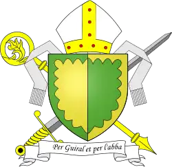 During one of his frequent pilgrimages to Rome (893-894),[7] he formalized by public deed his willingness to donate his seigniorial estates and benefices of Aurillac to St. Peter the Apostle, for the purpose of building an abbey dedicated to him and maintaining “an abbot, 39 monks and some persons, lay or regular, in the service of the house,” and to pay an obolus of five solidi to St. Peter each year;[8] the abbey, according to Gerald's intentions, was placed by Pope Formosus directly under the dependencies of the Holy See.[9]