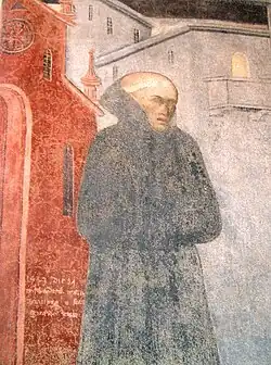 The cloister (likely built in the 14th century, and restored in the following one) includes a portico with rib vaults on all four sides. A series of pillars supports, in the upper floor, a loggia with small columns. Under the lower floor are two registers of frescoes executed in the late 15th century, and depicting the Life of St. Benedict. The scenes were mostly based on episodes of the saint's life as narrated by Gregory the Great. The style of the surviving frescoes is late Gothic.