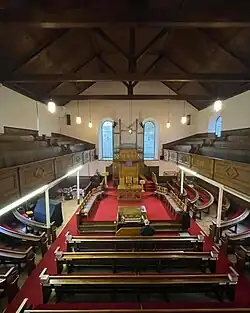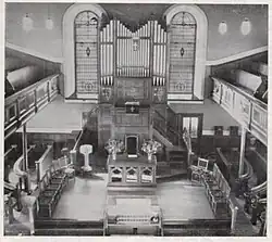 After completion of the building, the congregation of Abbeygreen immediately organized Sabbath day (Sunday) and regular Schools with supporting libraries,[98] and built the church manse[99][83] later in 1844. A Free Church School was built on Peasehill,[100][83] Lesmahagow, in 1851. The church also established a number of mission stations in the local area resulting in the planting of a number of congregations which then developed within the Free Church of Scotland. The church in the neighbouring village of Coalburn[101][102][103] was one such mission station established in 1893, becoming an independent Free Church congregation in November 1895[104] with Rev. Peter Walker[105] who ministered there until 1934. Additionally, Free Church congregations were established in the villages of Douglas,[106][107][108] (with the church being built in 1845),[109][110] and Rigside/Douglas Water,[111][112][113][114] (with the church being built in 1886).[58] Each of these resulted, at least in part, from the open air preaching ministry during the summer of 1843 and following.
