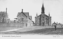 The Church of Scotland congregation at St. Leonard's was constituted on 27 May 1839 and the church was built and opened in 1841 on Bannatyne Street, adjacent to the site of the soon to be Lanark railway station. The church was situated just east of the station entrance and between the station buildings and Bannatyne Street. The station buildings were built in 1855 by the Caledonian Railway. Thomas Stark (b.1803) was ordained as a minister to the congregation on 29 June 1841 and became a minister of the Free Church in 1843. Dispute between the Church of Scotland and the Free Church over the property, led to the building being closed from 1845 to 1851[56][57] and the Free Church congregation bought the Associate Burgher church in Hope Street, Lanark[58][59][39] and developed it for the needs of the congregation.