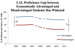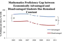 One evaluation concluded that the effect on academic achievement in Abbott districts was greater in lower grades and declined in subsequent grades, until there was no effect in high school. The achievement gap in math test scores for fourth graders narrowed from 31 points in 1999 to 19 points in 2007, and on reading tests from 22 points in 2001 to 15 points in 2007. The gap in eighth grade math narrowed less, from 30 points in 2000 to 26 points in 2008, and did not change in reading. The gap did not narrow in high school.[5] In addition, a 2012 study by the New Jersey Department of Education determined that score gains in the Abbotts were no higher than score gains in high-poverty districts that did not participate in the Abbott lawsuit and therefore received much less state money.[6]