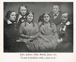 Abby Hutchinson was born in Milford, New Hampshire, on August 29, 1829. She was the fourth daughter and the sixteenth and youngest child of Jesse Hutchinson (1778–1851) and Mary Hastings Leavitt (1783–1868), descendants of the Pilgrims. Thirteen of those children lived to adult age, but in 1892, only John and Abby were living.[1]