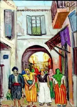 Gorgi was born in the Tunisian medina in 1928 and studied at the Tunis Institute of Fine Arts before beginning an artistic career in France.[1] He helped create the Tunis School of painting which he led until 1983.[1] He established his own art gallery, the Gorgi Gallery, in 1973 which mainly shows works of new Tunisian artists.[1] His paintings and tapestries have been featured in exhibitions across the world.[1] Gorgi taught drawing, ceramics and painting at the Institute of Fine Arts from 1959 to 1983.[2][3]