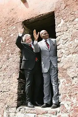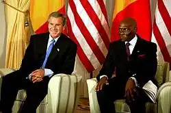 Wade subsequently spent a year in France, returning to Senegal on 27 October 1999.[17][18] In the first round of the 2000 presidential election, held on 27 February, he again took second place, receiving 31% of the vote, but for the first time, Diouf did not win a first round majority,[8] and consequently a second round was held on 19 March. Wade won this round with 58.49% of the vote,[8][19] having received the support of candidates from the first round, including third place candidate Moustapha Niasse. Wade became President on 1 April 2000 and appointed Niasse as his Prime Minister shortly afterwards.[19] Wade initially cohabited with the PS, which held a majority in the legislature until the PDS and its allies (the Sopi Coalition) won a majority in the April 2001 parliamentary election.