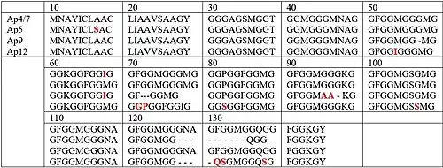 Peptide sequences such as MGGG, FGGMG, FGGMGGG, GGFGGMGGG, and FGGMGGGNAG are repeated throughout the peptide chain.[3] It is to note that these peptide sequences all contain glycine. Additionally, in Argopecten irradians, the pentapeptide FGGMG is repeated throughout the molecule.[5] The main peptide sequence feature of abductin is the presence of many repeating sequences, all of which contain glycine residues. This is similar to that of the structure of elastin.