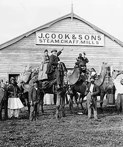Afghan cameleers in Australia, also known as "Afghans" (Pashto: افغانان) or "Ghans" (Pashto: غانز), were camel drivers who worked in Outback Australia from the 1860s to the 1930s. Small groups of cameleers were shipped in and out of Australia at three-year intervals, to service the Australian inland pastoral industry by carting goods and transporting wool bales by camel trains. They were commonly referred to as "Afghans", even though the majority of them originated from the far western parts of British India, primarily the North-West Frontier Province and Balochistan (now Pakistan), which was inhabited by ethnic Pashtuns (historically known as Afghans) and Balochs. Nonetheless, many were from Afghanistan itself as well. In addition, there were also some with origins in Egypt and Turkey.[1] The majority of cameleers, including cameleers from British India, were Muslim, while a sizeable minority were Sikhs from the Punjab region. They set up camel-breeding stations and rest-house outposts, known as caravanserai, throughout inland Australia, creating a permanent link between the coastal cities and the remote cattle and sheep grazing stations until about the 1930s, when they were largely replaced by the automobile.[1] They provided vital support to exploration, communications and settlement in the arid interior of the country where the climate was too harsh for horses. They also played a major role in establishing Islam in Australia, building the country's first mosque at Marree in South Australia in 1861, the Central Adelaide Mosque (the first permanent mosque in Adelaide, still in use today), and several mosques in Western Australia.
