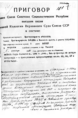 The case was discussed on 4 October 1938 by the Military Collegium of the Supreme Court of the Soviet Union, whereupon, according to the transcript, a 15 minutes long show trial took place the following day without hearing witnesses. The trial ended with Fitrat's sentence to death by a firing squad and confiscation of all goods. Archival documents show that the execution was carried out on 4 October 1938, thus on the day before his conviction.[90]