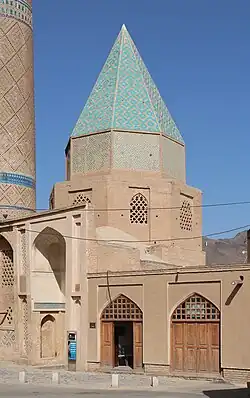 After his death, Abdul Samad al-Isfahani was buried in Natanz.[1] A shrine was built over his grave under the orders of his disciple Shams al-Din Natanzi,[1] with assistance from the vizier of the Mongol Ilkhanid ruler Muhammad Khudabandah, Zayn al-Din Mastari.[1] The tomb of Al-Isfahani now stands in the center of the Jameh Mosque of Natanz, under its conical dome.[1]