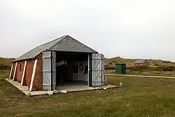 On the opposite side of the road stands Haurvig Rescue Station (Haurvig Redningsstation), which was decommissioned in 1932. Abeline purchased the building and used it as a place where the local youth could dance to Gramophone records or accordion music until violations of the alcohol ban became too evident.[3] [4]