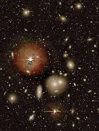 The Hydra Cluster (or Abell 1060) is a galaxy cluster that contains 157 bright galaxies, appearing in the constellation Hydra.[4] The cluster spans about ten million light-years and has an unusually high proportion of dark matter.[5] The cluster is part of the Hydra–Centaurus Supercluster located 158 million light-years from Earth. The cluster's largest galaxies are elliptical galaxies NGC 3309 and NGC 3311 and the spiral galaxy NGC 3312 all having a diameter of about 150,000 light-years.[6] In spite of a nearly circular appearance on the sky, there is evidence in the galaxy velocities for a clumpy, three-dimensional distribution.[7]