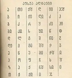 The first Abkhaz alphabet was created in 1862 by Peter von Uslar. It had 55 letters and was based on the Cyrillic script. Another version, having 51 letters, was used in 1892 by Dimitry Gulia and K. Machavariani.[3][4] In 1909, the alphabet was again expanded to 55 letters by Andria Tchotchua to adjust to the extensive consonantal inventory of Abkhaz.