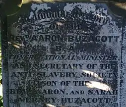 Recently rediscovered is the grave of Olaudah Equiano's daughter Joanna Vassa, as he was a well-known former slave who worked for abolition.[15] Jamaican emancipation is represented directly by the Rev. Samuel Oughton and the Rev. Thomas Burchell, who only narrowly escaped death at the hands of the planters; and their underlying Baptist support by Nathaniel Rogers M.D. A deacon at the Burchell Baptist church, the African Samuel Sharpe, became a Jamaican hero. Aaron Buzacott, the second Secretary of Anti-Slavery International, originally known as the Anti-Slavery Society, is buried here.