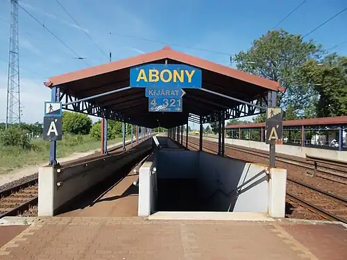 Abony railway station (Hungarian: Abony vasútállomás) is a railway station of the Hungarian State Railways (MÁV) in Abony, Hungary. The station is located on the Budapest–Cegléd–Szolnok railway (Line 100A).