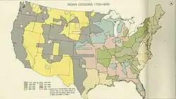 This shift in policy resulted in all tribal lands being either ceded to the federal government or designated as an Indian reservation in Iowa, Minnesota, Texas, and Kansas by 1870; Idaho, Washington, Utah, Oregon, Nevada, Wyoming, Nebraska, and Colorado by 1880; and Montana, Arizona, and New Mexico by 1886.[5] Whereas, "it had taken whites 250 years to purchase the Eastern half of the United States, ... they needed less than 40 years for the Western half."[5] Unlike the Eastern purchases, "some of the transactions in the West involved immense areas of land. More than 75 percent of Nevada, for example, was acquired in two bites; the large majority of Colorado in three. It was not long before the West was dotted with Indian reservations."[5]