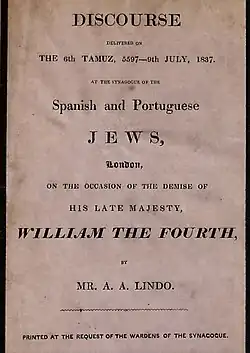 - ^ "Obituary: Abraham A. Lindo, July 8, 1849". www.jewish-history.com. Retrieved 2023-01-28.