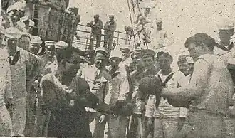 Hollandersky's long career with the Navy included work as an independent supply boat operator or "bum boater" from which he sold magazines and newspapers to the fleet. His boat was a small motorized dingy that was rumored to have been given to him by Admiral Robley Evans. Early in his career, Abe saved several people from drowning and rescued stranded boats in Gardiner Bay off the docks of New London while "bum boating" for the Navy. "Bum boating" consisted of taking a small launch out to naval vessels and selling newspapers, magazines, and small supplies to Navy personnel. In his small launch, he also performed tasks such as delivering mail to naval ships.[49] In his mid-career with the Navy, he worked as a boxing instructor for sailors at the pier in New London near the end of WWI, and as a recruiter of 1,700 naval personnel in WWII while he was living in Los Angeles. He also gave boxing exhibitions and training, and sold newspapers to Naval ships during his world cruises. After cruising to California in 1925, Abe helped the Navy provide relief for the aftermath of the Santa Barbara earthquake that struck on June 29, 1925. He raised War Bonds in WWII, occasionally capitalizing on his contacts with former boxers, and entertainers, such as Jimmy Durante, with whom he had worked in a movie. He later assisted the Navy in providing relief following the March 10, 1933 Los Angeles area earthquake that had an epicenter near Long Beach, California, where he had his news stand. He was caught in the earthquake on the day it struck, and narrowly escaped injury.[50] By 1947, the Navy bestowed on Abe the "Award of Merit" for his recruiting of both men and women for WWII.[51]