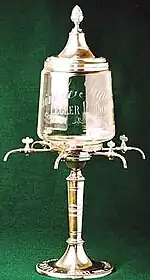 Most often the fountain design includes a large glass globe with multiple (2–6) spigots filled with ice and water on a tall metal stand. Swiss fountains are occasionally made of pottery with a lot of spigots.[9]