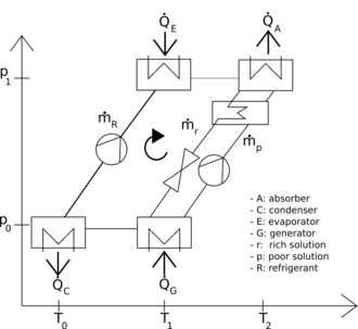 For the absorption heat pump circulation, the absorber, generator and pump can be regarded as a "thermal compressor". The absorber is equivalent to the inlet side of the compressor, and the generator is equivalent to the outlet side of the compressor. The absorbent can be regarded as a carrier liquid that transports the generated refrigerant gas from the low-pressure side of the cycle to the high-pressure side.[5]