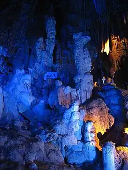 Abukuma-dō (あぶくま洞 - Abukuma Cave) is a limestone cave located in Fukushima Prefecture, Japan. [1]The cave was discovered on August 15, 1969, northeast of the city of Tamura and was originally named Kamayama Shonyu-do (釜山鍾乳洞). It was designated a natural heritage of the town on February 7, 1971, and renamed Abukuma-dō on June 1,1973.[2] Visitors can traverse a 600-metre-long path inside the cave as well as a 120-metre-long exploration course to view the stalactites and stalagmites. Each stalactite has taken more than eighty million years to form.[3] Beyond the public areas lie about 2,500 metres of cave that are not open to the public. Nearby Abukuma Cave is the smaller Irimizu Shonyu-do (入水鍾乳洞 - Irimizu Limestone Cave), discovered in 1927. Irimizu Limestone Cave was designated a National Natural Treasure on December 28, 1934.[4] The temperature inside Abukuma-dō is approximately 15 °C and the humidity is above 90%.
