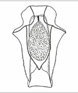 The species has an anterior nectophore that is the same size both broad and wide. It also has very heavy irregular and serrate ridges. The ventral facet is not separated from the apico-ventral facet. The posterior nectophore can have from 4 to 11 teeth on a comb. It also has two rows of very serrated teeth on the basal margin.[3]