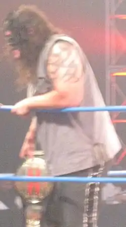 On the following episode of Impact!, Abyss was forced to give Chelsea's custody back to Desmond Wolfe, much to the reluctance of Chelsea. Later in the night, he competed in a three-way match against Mr. Anderson and Jeff Hardy to determine a number one contender to Rob Van Dam's TNA World Heavyweight Championship, which ended in a triple countout. After the match, Abyss turned heel by destroying both of his opponents and having a heated confrontation with Hogan.[39] The following week Abyss revealed that he was being controlled by an entity, who was coming to TNA, before returning Hogan's Hall of Fame ring to him, shoving it down his throat.[40] On the July 15 episode of Impact! the new top ten rankings were revealed with Abyss picking up the top spot to become the new number one contender to Rob Van Dam's TNA World Heavyweight Championship.[41] Abyss then began going after Van Dam with a new weapon, a board filled with nails, which he named Janice,[41] which led to Eric Bischoff booking him and Van Dam to face each other in a Stairway to Janice match for the TNA World Heavyweight Championship, with Bischoff himself serving as the referee of the match.[42] The match took place on the August 12 episode of Impact!, when Van Dam defeated Abyss to retain the title. After the match Abyss joined Fourtune members A.J. Styles, Kazarian, Robert Roode, James Storm, Douglas Williams and Matt Morgan in assaulting Van Dam and the rest of EV 2.0, a stable consisting of former Extreme Championship Wrestling performers, during which he apparently hit Van Dam with Janice.[43] As a result of the attack Van Dam was sidelined with a storyline injury, which forced him to vacate the TNA World Heavyweight Championship the following week.[44] This led to people like Jeff Hardy, Hulk Hogan and members of EV 2.0 targeting Abyss in order to avenge their fallen friend.[44][45] At No Surrender on September 5, Abyss defeated EV 2.0 member Rhino in a Falls Count Anywhere match.[46] Rob Van Dam returned on the September 23 episode of Impact!, confronting Abyss and demanding a match against him at Bound for Glory on October 10, which Eric Bischoff agreed to give him. Later that same night Abyss attacked Jeff Hardy, trying to make an example out of him, while also beating down the heavily taped up Van Dam, when he tried to make the save.[47] On the October 7 live episode of Impact! Abyss was about to be fired by Bischoff for manhandling TNA president Dixie Carter, but was saved by Van Dam, who threatened to quit the company if he wasn't allowed to face Abyss at Bound for Glory. Later in the night Carter agreed to let Van Dam face Abyss, but signed papers to have Abyss fired from TNA the day following the pay–per–view.[48] At Bound for Glory Van Dam defeated Abyss in a Monster's Ball match, after using Janice on him. At the end of the event it was revealed that the entity, who had been controlling Abyss, was an alliance of Hulk Hogan, Eric Bischoff, Jeff Jarrett and the new TNA World Heavyweight Champion Jeff Hardy, all of whom turned heel and aligned themselves with Abyss.[49] On the following episode of Impact! the stable was named Immortal, as it formed an alliance with Ric Flair's Fortune.[50] Afterwards, Abyss began attacking planted fans, which led to D'Angelo Dinero challenging him to a Lumberjack match.[51] The match took place at Turning Point on November 7, where Dinero's own brother and the rest of his lumberjacks turned on him, after being bought out by Eric Bischoff, and helped Abyss pick up the win.[52] The following month at Final Resolution on December 5, Abyss defeated Dinero in a casket match.[53] On January 9, 2011, at Genesis Abyss replaced an injured A.J. Styles and defeated Douglas Williams, with help from an interfering Styles, to win the TNA Television Championship for the first time.[54] On the January 20 episode of Impact!, as Immortal was attacking Kurt Angle, Crimson made the save for him and hit Abyss in the back with Janice, causing him storyline injuries, which indefinitely sidelined him from TNA.[55]
