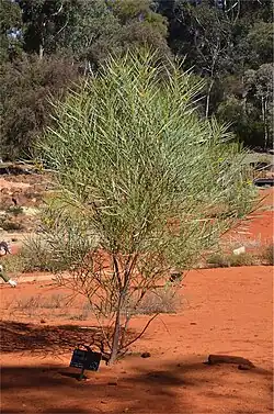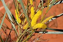Acacia ammobia, commonly known as the Mount Connor wattle,[3] or Mount Conner wattle,[4] is a species of flowering plant in the family Fabaceae and is endemic to areas near the border between South Australia and the Northern Territory. It is a shrub or small tree with linear phyllodes, flowers arranged in 1 or 2 spikes on side shoots, each spike with densely crowded yellow flowers. The fruit is a linear pods 55–110 mm (2.2–4.3 in) long with dar brown seeds.
